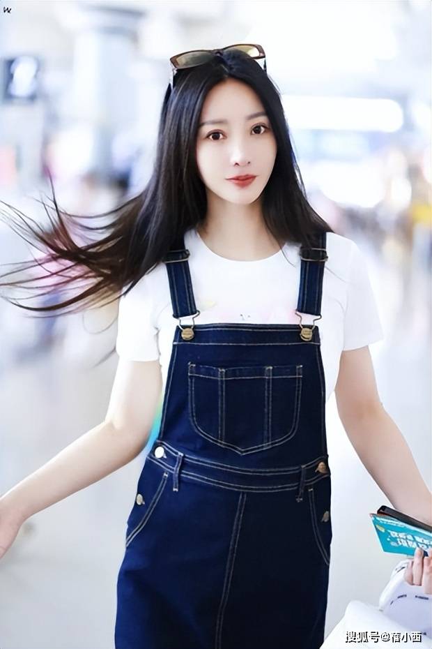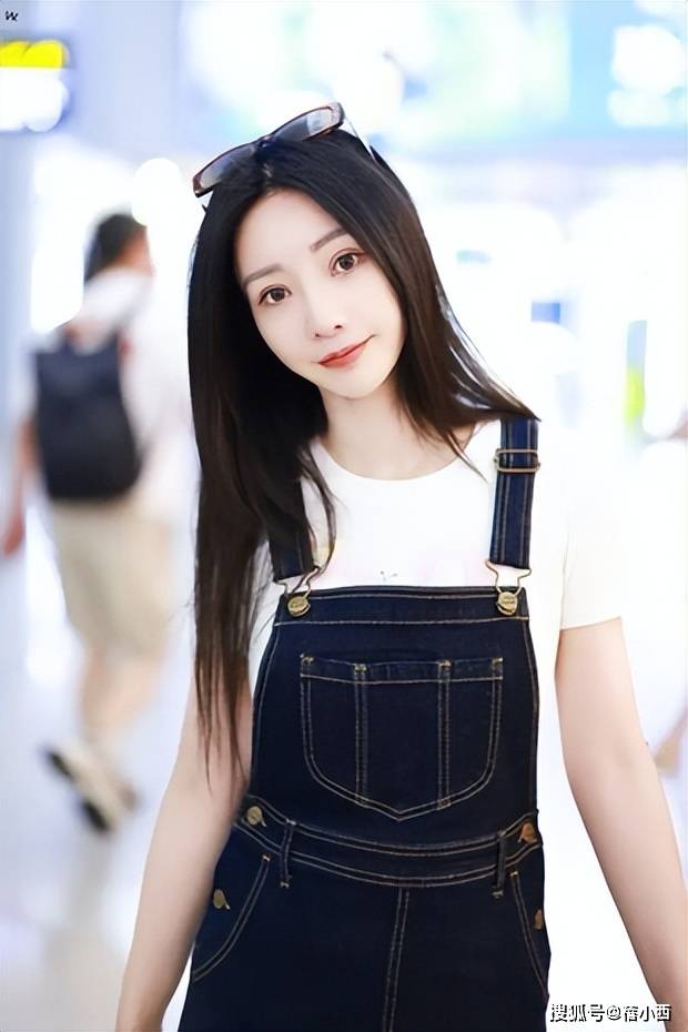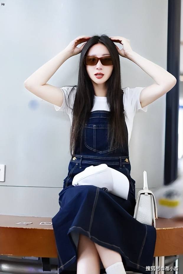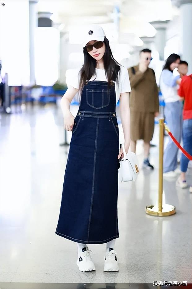 她搭配的深蓝色牛仔背带裙,巧妙结合了经典与时尚。牛仔材质自带休闲气息,而背带设计则增添了几分青春活力和俏皮感。裙子的中长款式既能展现优雅气质,又不会显得过于拖沓。脚下的厚底运动鞋,不仅能拉高身高,还带来了运动感,整体造型充满了活力和动感。再加上她佩戴的墨镜与棒球帽,瞬间提升了时尚感,为造型增添了几分酷感与神秘感。