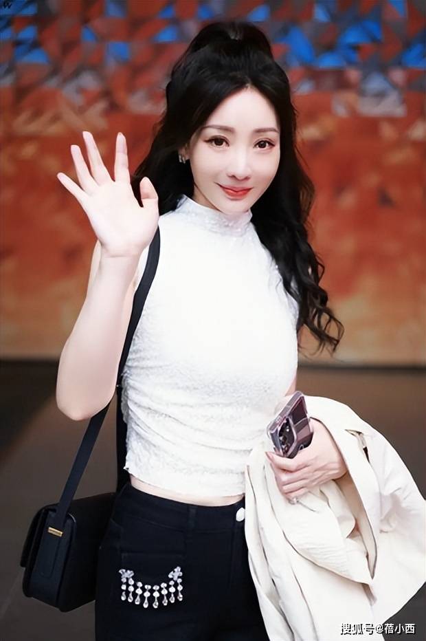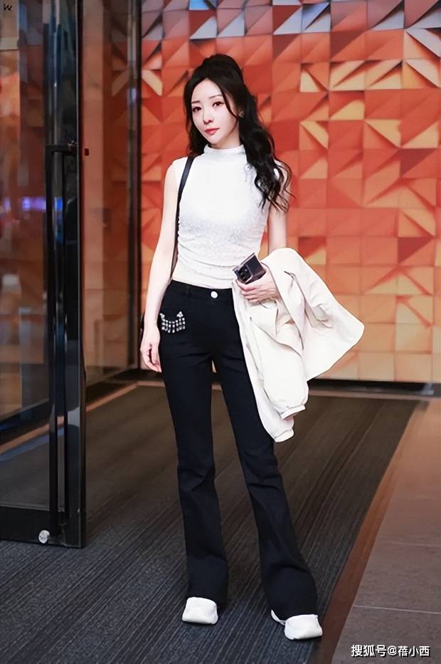 黑白配色一直是时尚界的经典,柳岩这一身搭配充分展现了这种经典配色的魅力。她穿着一件白色无袖上衣,设计简单却不失精致感,露出了她的肩部和手臂线条,清爽又利落。上衣采用针织材质,质感十足,纹理细节也让整体造型更具视觉吸引力。高领的设计,不仅修饰了颈部线条,还为整体增添了一丝时尚感。