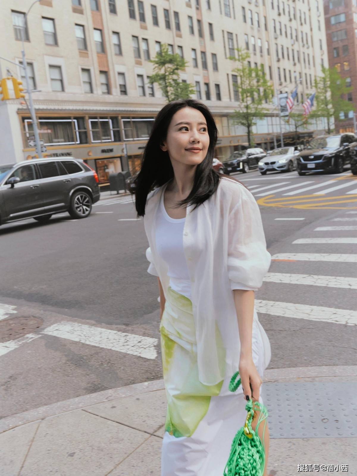 她选择的内搭背心是纯白色的,这样的搭配不仅减龄,还是清爽又舒适的选择,几乎每个人都喜欢这种搭配。下身搭配的是一条别致的半身裙,裙子设计精巧,采用了三种不同的颜色和大图案,整体视觉效果十分吸引人。