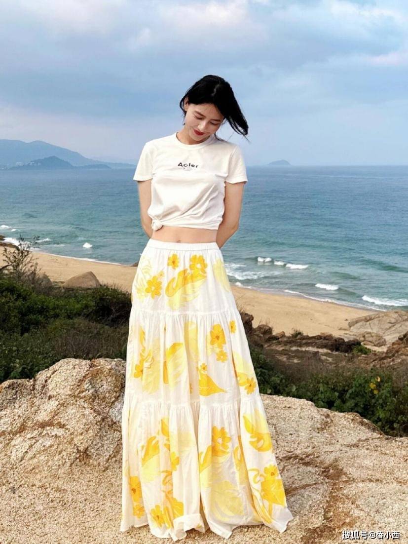 下身搭配的这条半身裙是一款减龄必备单品,30岁左右的女性也能轻松驾驭。裙子的设计层次感十足,从上到下逐渐变大的花纹和颜色搭配,视觉上既活泼又和谐,黄色与白色的搭配让整个人看起来既清新又养眼。