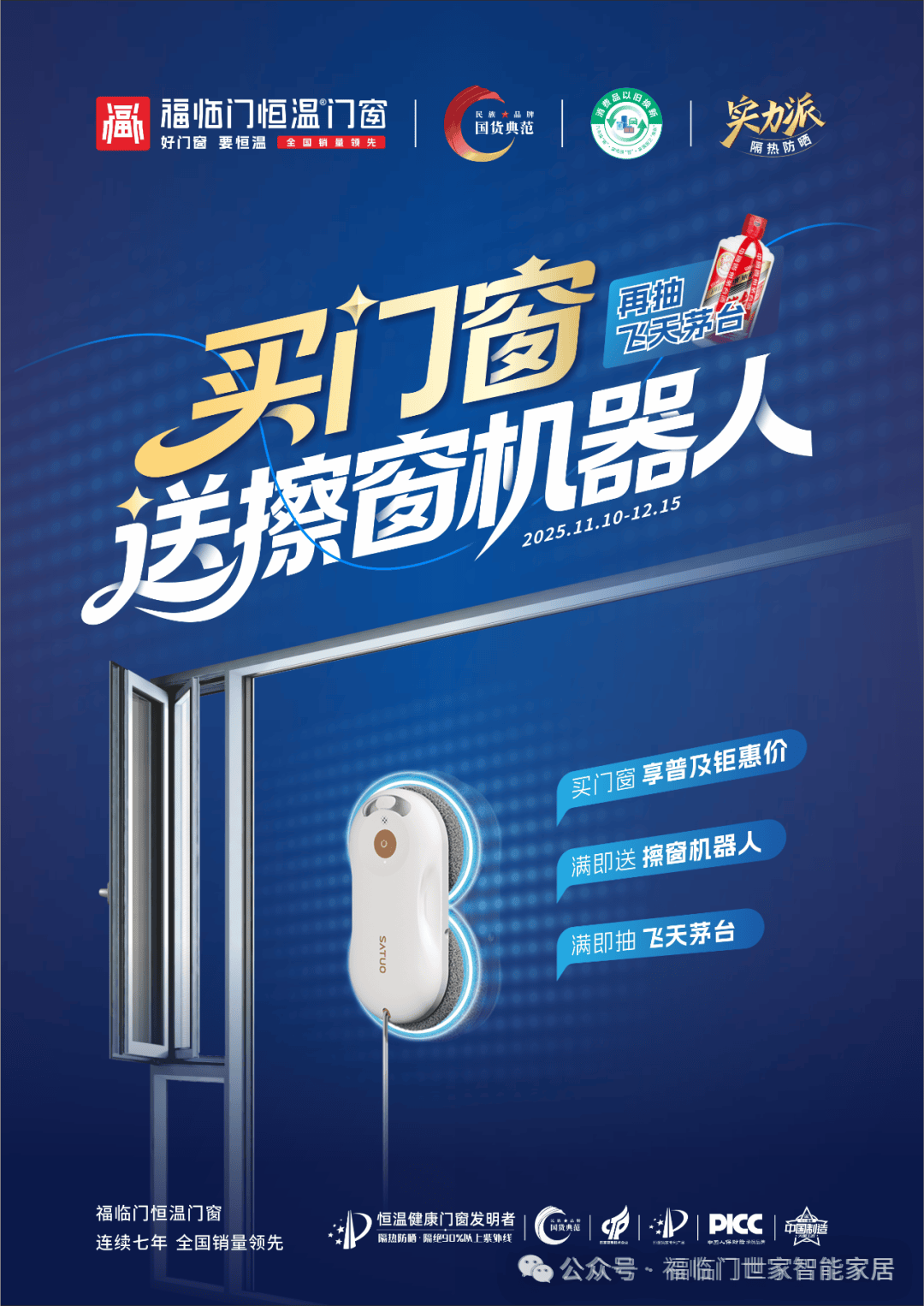 惊喜再升级!11月10日-12月15日,#福临门恒温门窗“买门窗送擦窗机器人”活动火热进行!作为年度重磅福利,本次活动更叠加飞天茅台抽奖、国家补贴、老客新客同享红包等多重豪礼等你来拿!